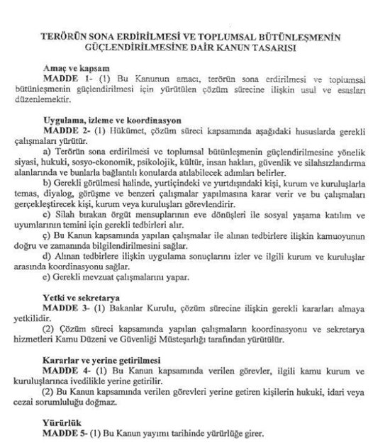 6 maddeden oluşan ve "çözüm sürecinin çerçeve yasası" olarak adlandırılan Terörün Sona Erdirilmesi ve Toplumlal Bütünleşmenin Güçlendirilmesine Dair Kanun Tasarısı'nın TBMM'ye sunuldu.