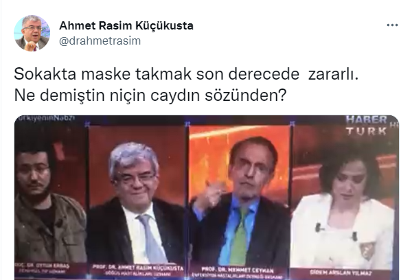 Prof. Dr. Ahmet Rasim Küçükusta, Mehmet Ceyhan'ın, Sağlık Bakanlığı'nın kararı ile kullanım alanları daraltılan maske konusundaki iki yüzlülüğünü geçtiğimiz yıl gerçekleşen bir canlı yayında kullandığı ifadeleri ile ortaya koydu.
