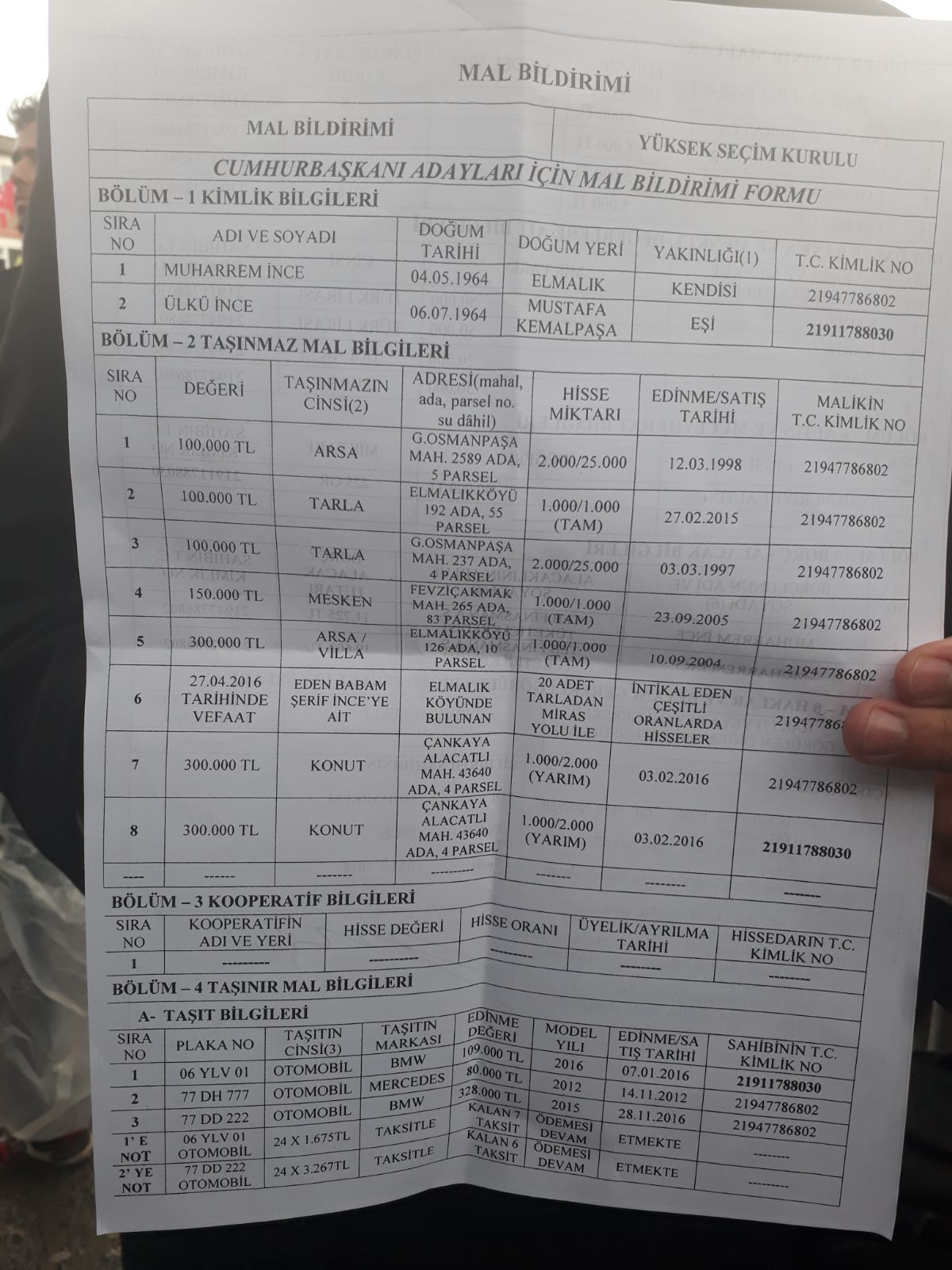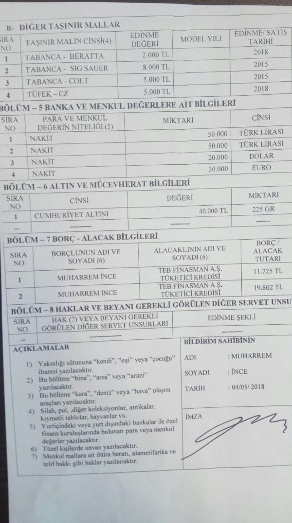 CHP'nin adayı Muharrem İnce, YSK'ya verdiği mal bildirimi formunu paylaştı.