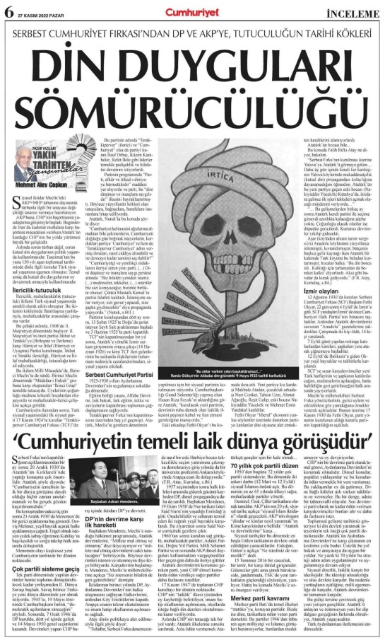 Yazıda Cumhuriyet rejiminin laiklik temeli üzerine kurulduğu vurgulandı. Mehmet Alev Coşkun’un kaleme aldığı yazıda, darbeci kemalistler tarafından idam edilen Başbakan Adnan Menderes hedef gösterildi. Ayrıca AK Parti hükümetiyle Demokrat Parti aynı kefeye konuldu.