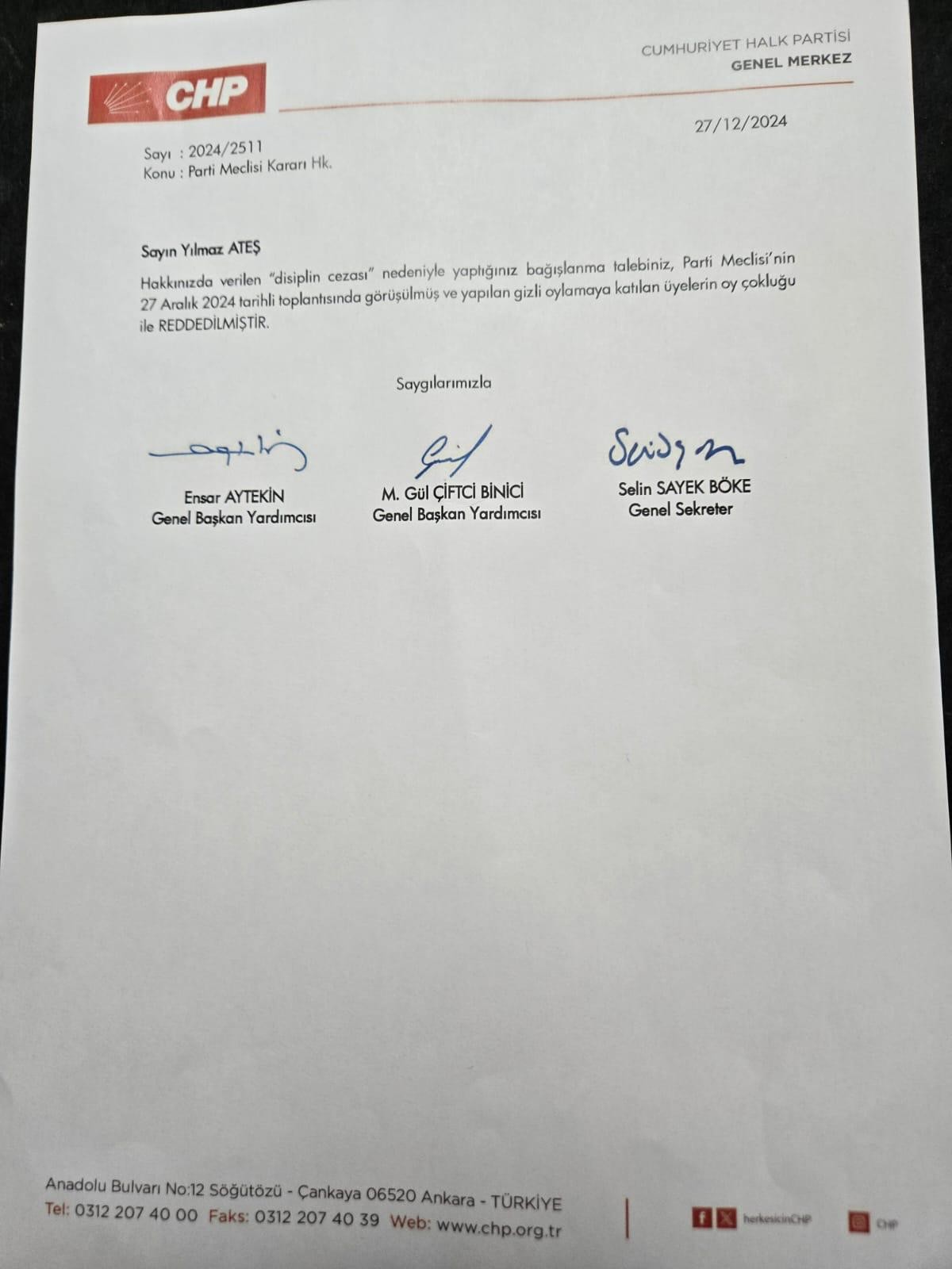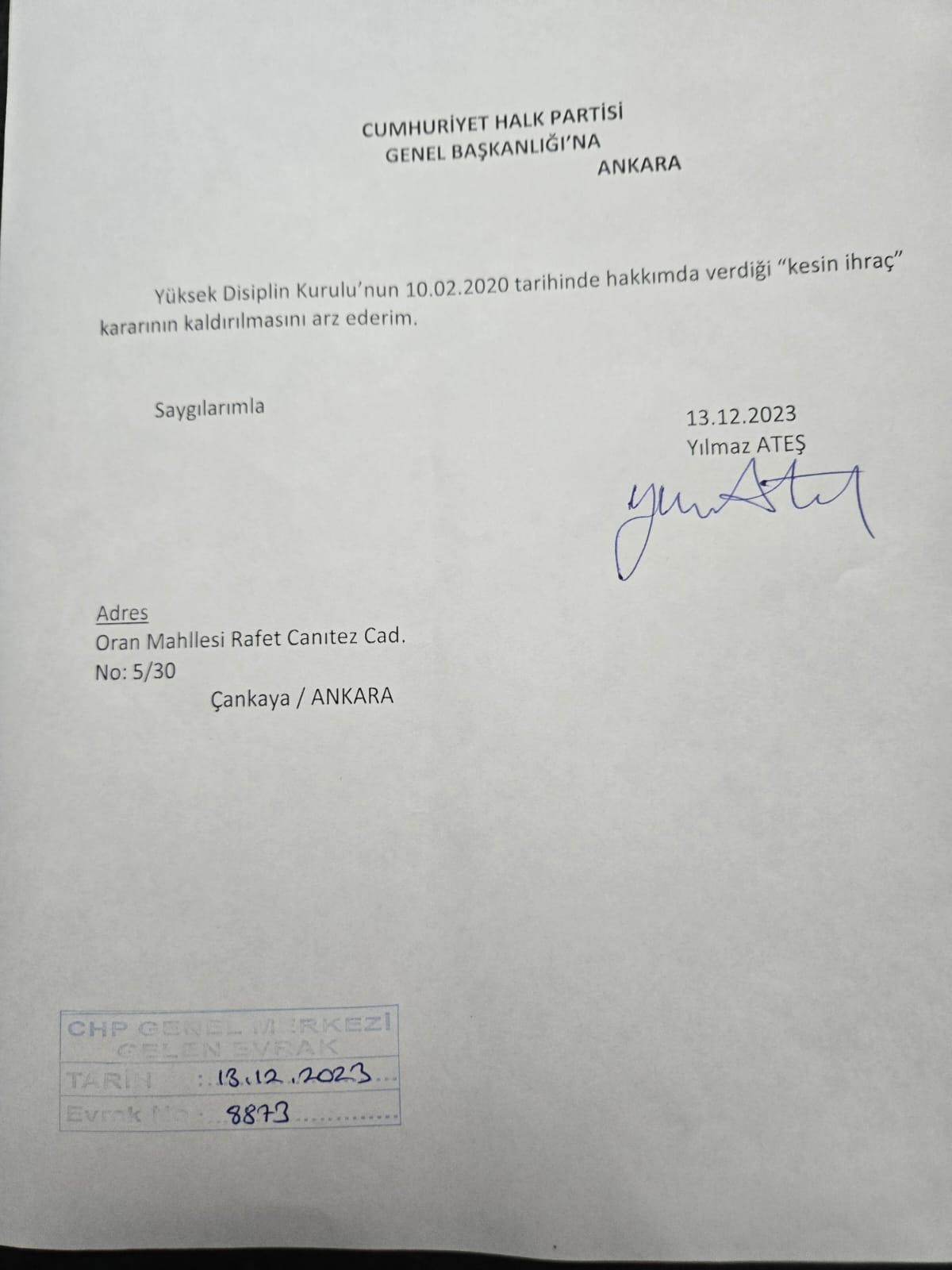 CHP Genel Başkan Yardımcısı Gül Çiftçi, dün akşam katıldığı canlı yayında, partiden ihraç edilen Yılmaz Ateş’in affı konusunda herhangi bir başvuru olmadığını ve böyle bir talep gelirse parti meclisinin değerlendirileceğini söylerken, Ateş’in partiye geri dönüş için başvuru yaptığı ve talebin reddedildiği belgelerle ortaya çıktı.