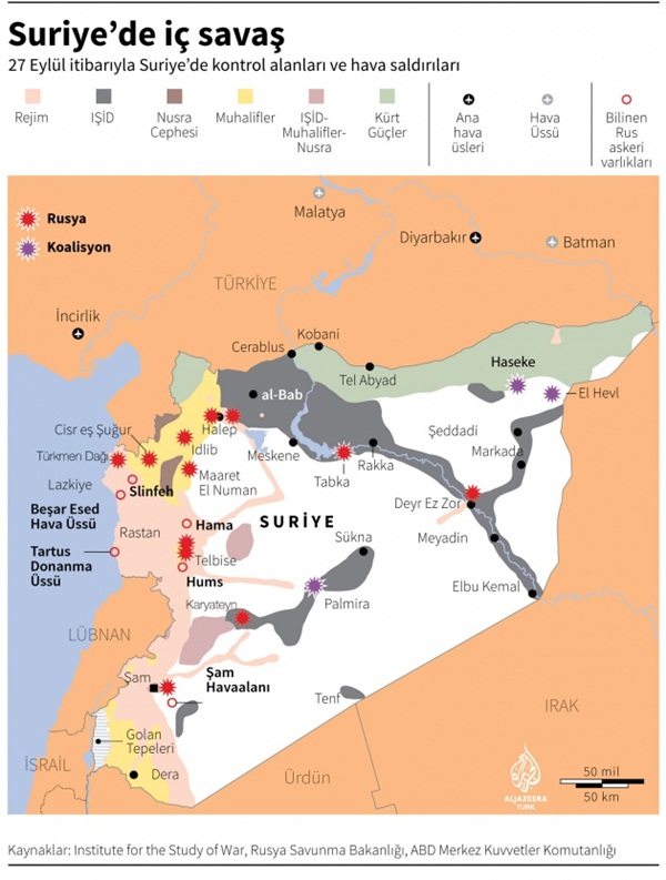1- Rakka kırsalı: -Rusya, kendisine yönelik ‘IŞİD’i değil muhalifleri vurduğu’ eleştirileri üzerine, IŞİD’in denetimindeki Rakka’nın kırsalında yer alan Tabka hava üssünü bombaladı.