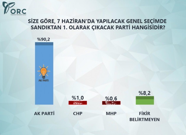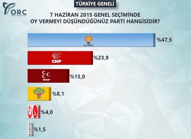 36 ilde 2450 kişiyle yapılan araştırma vatandaşlara '7 Haziran 2015 genels eçimlerinde 'hangi partiye oy vermeyi düşünüyorsunuz' sorusunun yanında '7 Haziran'daki seçimden sizce sandıktan hangi parti birinci çıkar' sorusu da yöneltildi.