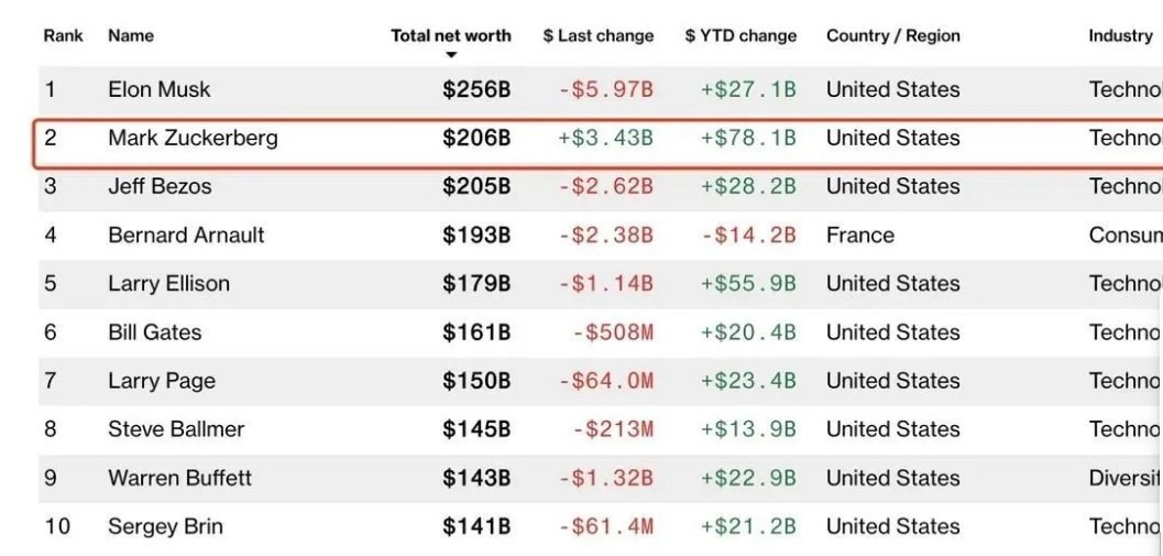 2- MARK ZUCKERBERG: 206 milyar dolar