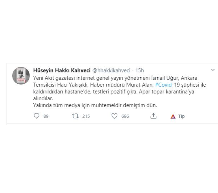 Sözcü Kitabevi Yazarı Hüseyin Hakkı Kahveci, Yeni Akit Gazetesi yöneticilerinin isimlerini kullanarak yayınladığı mesajında, "Yeni Akit Gazetesi İnternet Genel Yayın Yönetmeni İsmail Uğur, Ankara Temsilcisi Hacı Yakışıklı ve Haber Müdürü Murat Alan covid-19 şüphesi ile kaldırıldıkları hastanede testleri pozitif çıktı. Apar topar karantinaya alındılar." ifadelerini kullandı. Kahveci'nin böylesine hassas bir konuda olmayan bir şeyi gerçek bir habermiş gibi paylaşması Sözcü eşrafının ahlak anlayışını yeniden gözler önüne sererken, aynı ismin twitter hesabından halkı paniğe sevk edecek birçok gerçek dışı paylaşım yaptığı da ortaya çıktı.