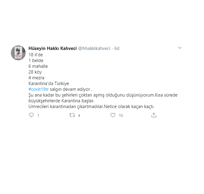 "18 il'de 1 belde 6 mahalle 28 köy 4 mezra Karantina'da. Türkiye'de covid-19 salgını devam ediyor. Şu ana kadar bu şehirleri çoktan aşmış olduğunu düşünüyorum. Kısa sürede büyükşehirlerde karantina başlar. Umrecileri karantinadan çıkartmadılar. Netice olarak kaçan kaçtı."