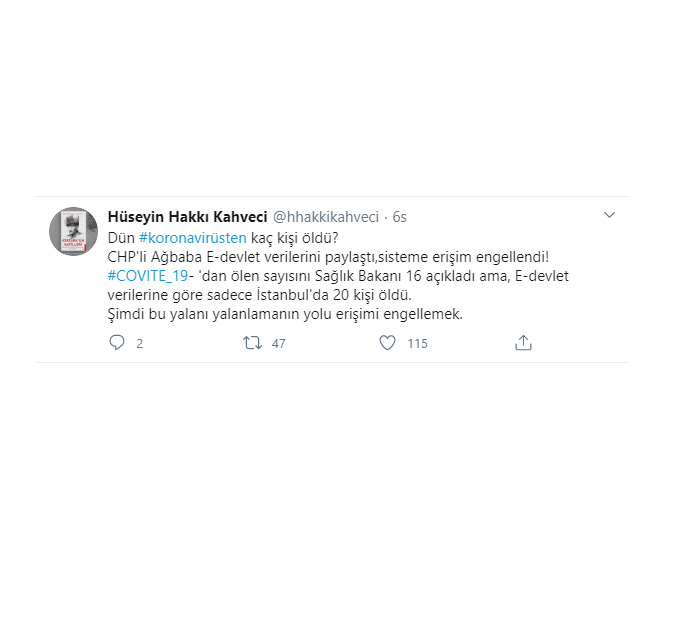 "Dün koronavirüsten kaç kişi öldü? CHP'li Ağbaba e-devlet verilerini paylaştı, sisteme erişim engellendi! Covid-19'dan ölen sayısını Sağlık Bakanı 16 açıkladı ama e-devlet verilerine göre sadece İstanbul'da 20 kişi öldü. Şimdi bu yalanı yalanlamanın yolu erişimi engellemek."