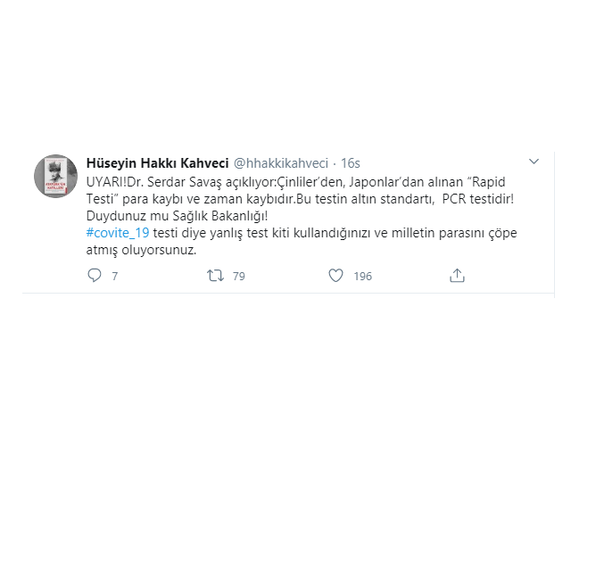 "Uyarı! Dr. Serdar Savaş açıklıyor: "Çinliler’den, Japonlar’dan alınan “Rapid Testi” para kaybı ve zaman kaybıdır. Bu testin altın standartı, PCR testidir!" Duydunuz mu Sağlık Bakanlığı! covid-19 testi diye yanlış test kiti kullandığınızı ve milletin parasını çöpe atmış oluyorsunuz."