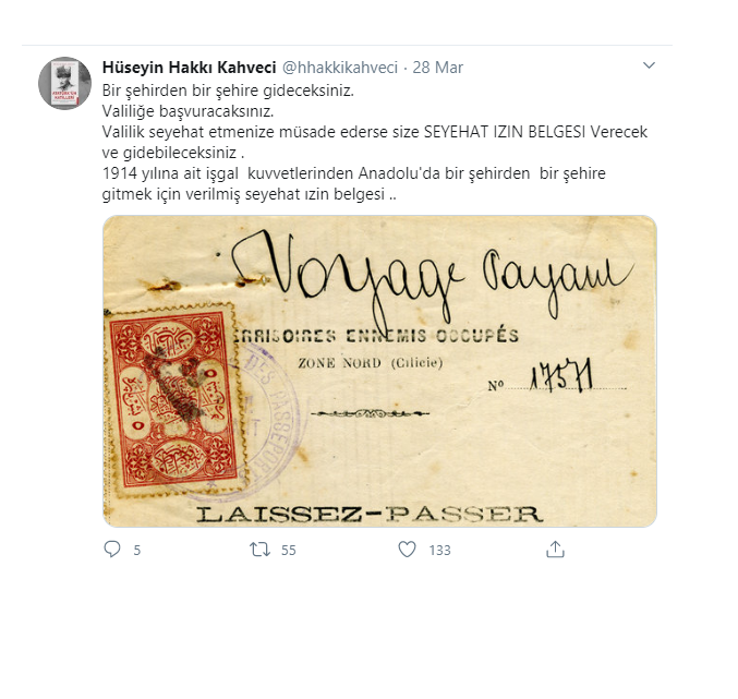 "Bir şehirden bir şehre gideceksiniz. Valiliğe başvuracaksınız. Valilik seyahat etmenize müsaade ederse size SEYEHAT İZİN BELGESİ verecek ve gidebileceksiniz. 1914 yılına ait işgal kuvvetleri tarafından Anadolu'da bir şehirden bir şehre gitmek için verilmiş seyahat ızin belgesi."