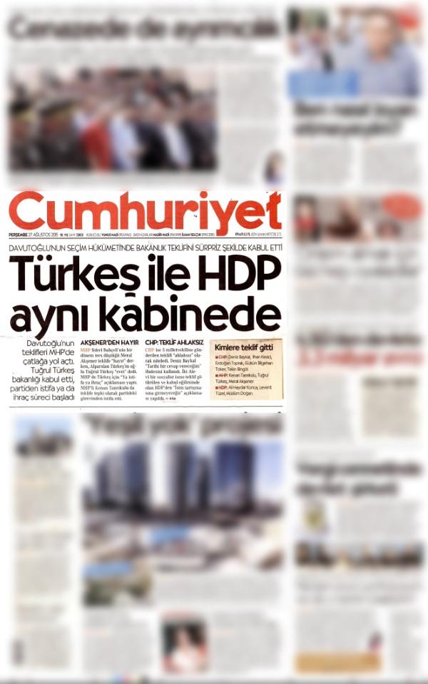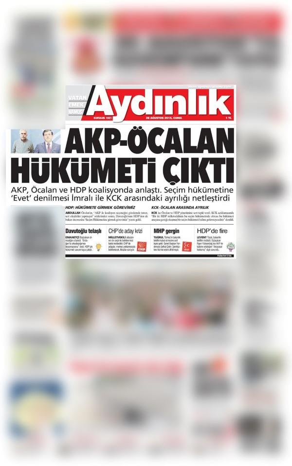 Dün geçici bakanlar kurulunda yer almaları için partililere tekliflerin iletilmesinin ardından malum koro, o bildik sesleri çıkarmaya başladı. Sözcü Gazetesi "Tayyip, PKK'lı dediği HDP ile kol kola seçime gidiyor" atmaktan geri durmadı. Konunun Cumhurbaşkanı ile alakası olmadığını, HDP'nin de geçici bakanlar kurulunda yer almasının AK Parti'nin tercihi değil, Anayasal zorunluluk olduğunu bildiği halde, çarpık zihniyeti manşetine yansıttı. İşte malum korunun malum manşetleri...