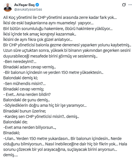 Hukukçular Birliği Vakfı Genel Başkanı Yaşar Baş, Fenerbahçe'yi şampiyonluğa hasret bırakan Ali Koç ile Türkiye'nin önündeki 'takoz' CHP'nin yönetimini kıyasladı.