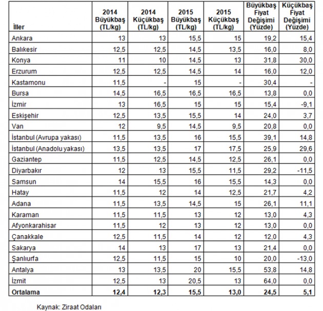 Ülke ortalamasına bakıldığında büyükbaş hayvanların canlı kilogram fiyatının 15,5 lira, küçükbaş canlı kilogram fiyatlarının ise 13 lira olduğu görülmektedir.