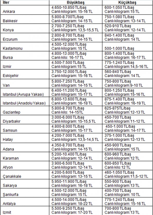 illere göre ve canlı ağırlığa göre değişmekle birlikte hayvan başına büyükbaşta 2 bin 700 lira ile 14 bin lira arasında, küçükbaşta ise 400 lira ile 1400 lira arasında değişeceği, canlı ağırlık fiyatının da büyükbaş hayvanlarda kilogram başına 12 ile 22 lira arasında, küçükbaşta kilogram başına 9 lira ile 19 lira arasında olacağı tahmin edilmektedir.