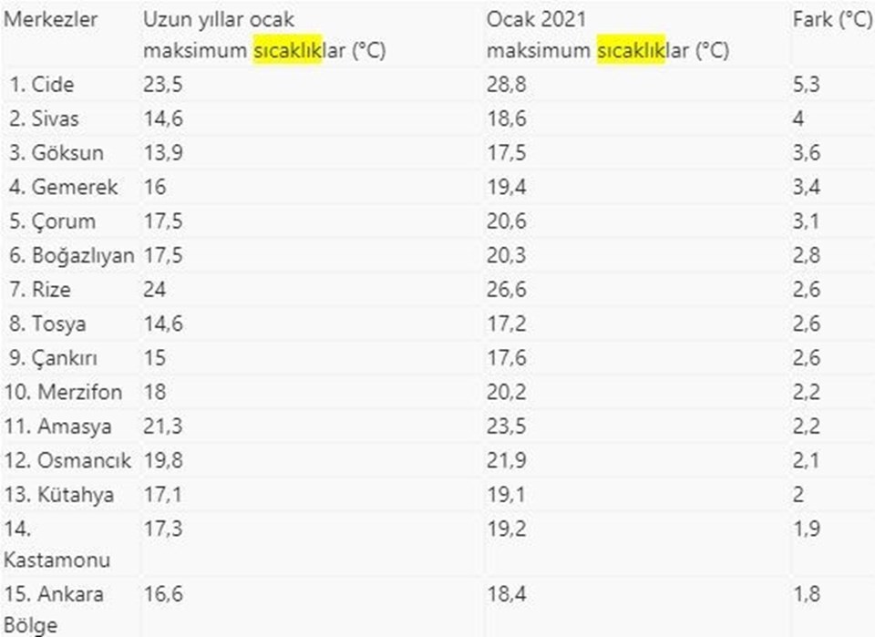 Ocak'ta Cide'de 5,3, Sivas'ta 4, Göksun'da 3,6, Gemerek'te 3,4 ve Çorum'da 3,1 derece sıcaklık farkları oluştu.