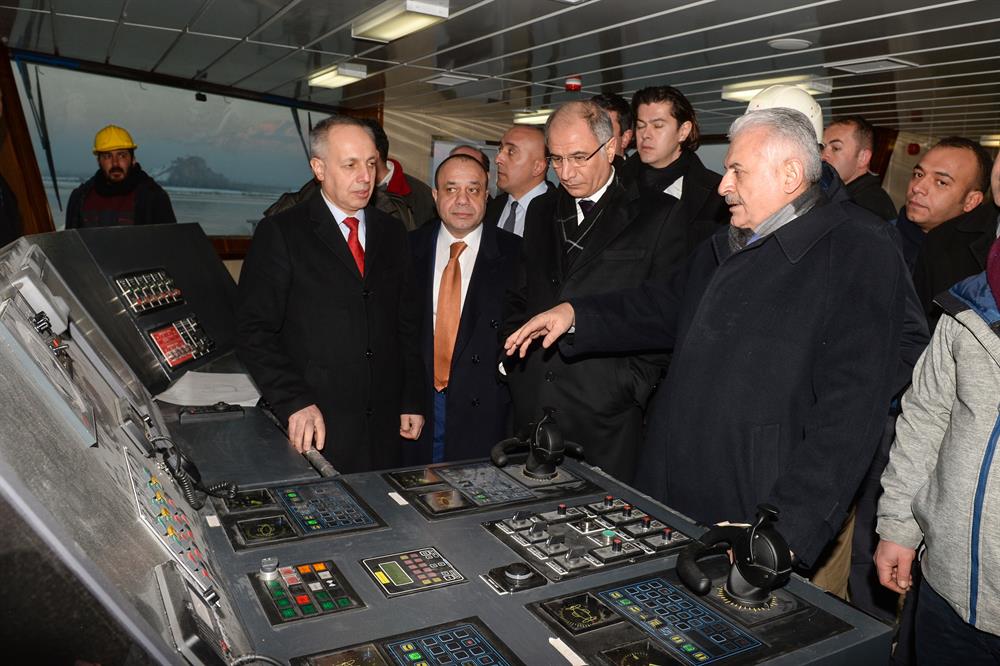 Yıldırım, İçişleri Bakanı Efkan Ala, Van Valisi İbrahim Taşyapan, AK Parti Van Milletvekili Beşir Atalay ile İskele sahilinde, Türkiye'nin en büyük feribotunu inceledi.