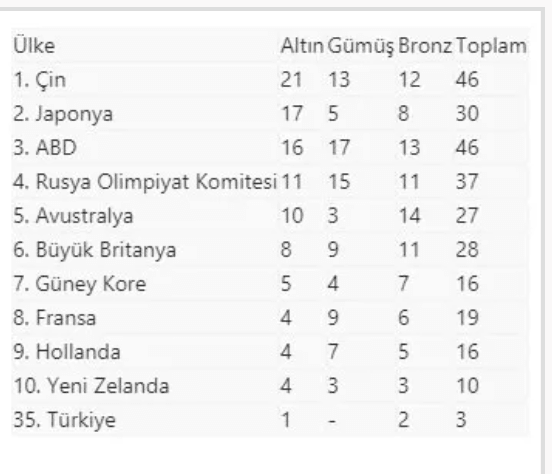 Tokyo 2020'de 8. gün sonunda madalya tablosunun zirvesindeki 10 ülkenin ve Türkiye'nin madalya sayısı şöyle: