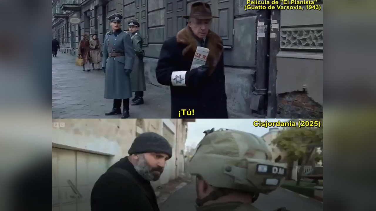Üstte, 1943 yılında Varşova'daki Nazi gettosunda Yahudilerin sokaklardan geçmesinin yasak olduğu ayrımcılığı yeniden canlandıran Piyanist filmi… Aşağıda ise, Filistinlilerin sokaklardan geçmelerinin yasaklandığı Batı Şeria'daki işgal edilmiş bölgedeki siyonist gettosu.
