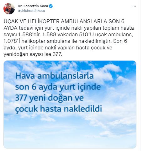 Resmi sosyal medya hesabından paylaşımda bulunan Sağlık Bakanı Fahrettin Koca, “UÇAK VE HELİKOPTER AMBULANSLARLA SON 6 AYDA tedavi için yurt içinde nakli yapılan toplam hasta sayısı 1.588’dir. 1.588 vakadan 510’U uçak ambulans, 1.078’İ helikopter ambulans ile nakledilmiştir. Son 6 ayda, yurt içinde nakli yapılan hasta çocuk ve yenidoğan sayısı ise 377.”dedi.