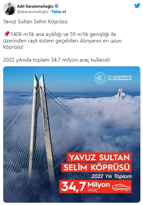 Ulaştırma ve Altyapı Bakanı Adil Karaismailoğlu, 1408 m'lik ana açıklığı ve 59 m'lik genişliği ile üzerinden raylı sistem geçebilen dünyanın en uzun köprüsü olan Yavuz Sultan Selim Köprüsü'nde 2022 yılında toplam 34,7 milyon aracın geçtiğini bildirdi.