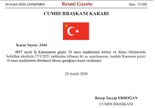 17 Ocak 2021’de sona ermesi gereken işten çıkarma yasağı 17 Mart 2021’e uzatıldı. Karar Resmi Gazete’de yayınlandı ve yürürlüğe girdi. 30 Aralık 2020 tarihli Resmi Gazete’de kararla ilgili olarak “4857 sayılı İş Kanununun geçici 10 uncu maddesinin birinci ve ikinci fıkralarında belirtilen sürelerin 17/1/2021 tarihten itibaren iki ay uzatılmasına mezkur kanunun geçici 10 uncu maddesinin dördüncü fıkrası gereğince karar verilmiştir" denildi.