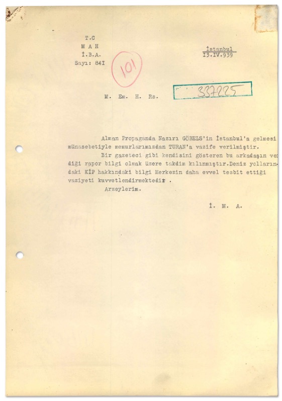 "Alman Propaganda Nazırı Goebbels'in İstanbul'a gelmesi münasebetiyle memurlarımızdan Turan'a vazife verilmiştir. Bir gazeteci gibi kendisini gösteren bu arkadaşın verdiği rapor bilgisi olmak üzere takdim kılınmıştır. Deniz yollarındaki KİP hakkındaki bilgi Merkez'in daha evvel tespit ettiği vaziyeti kuvvetlendirmektedir. Arz eylerim."