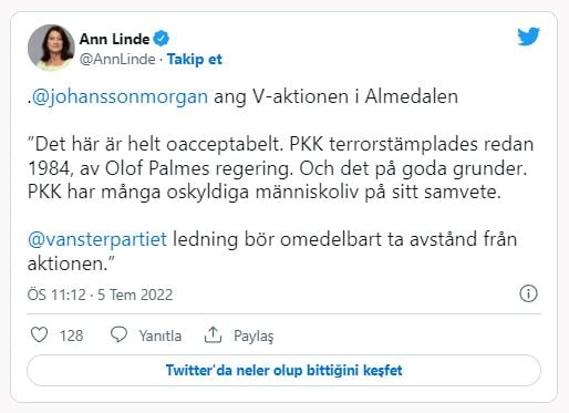 Linde, Twitter hesabından Adalet ve İçişleri Bakanı Morgan Johansson'u da etkileyerek, ''Bu kesinlikle kabul edilemez, PKK, 1984 yılında Olof Palme hükümeti tarafından terörist örgüt ilan edilen ve birçok masumun canına kıyarak vicdanları yaralayan bir örgüttür. Sol parti PKK eylemini derhal bırakmalıdır.'' ifadelerini kullandı.
