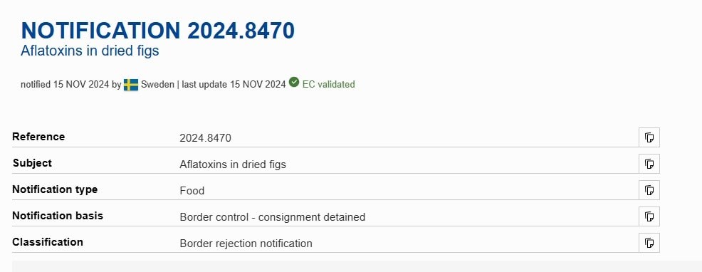 Avrupa Birliği'nin bu tür gıdaları ifşa ettiği RASFF sisteminde son yapılan güncellemelere göre 15 Kasım tarihinde Türkiye'den İsveç'e gönderilen tonlarca ağırlığındaki kuru incirde belirtilen yasal sınırın yaklaşık 3 katı kadar aflatoksin tespit edildi.