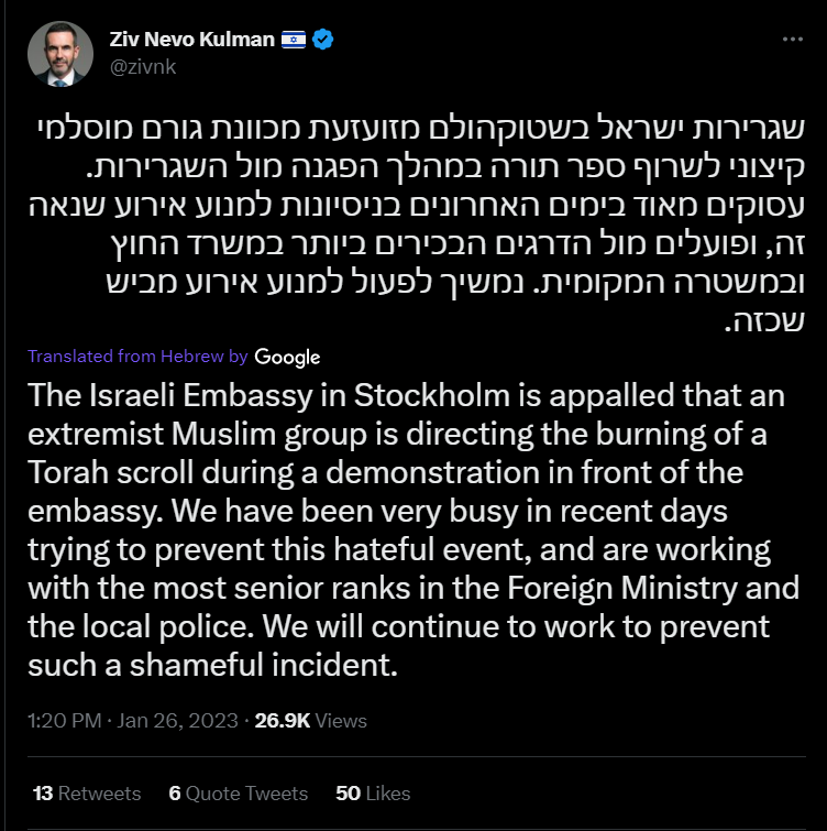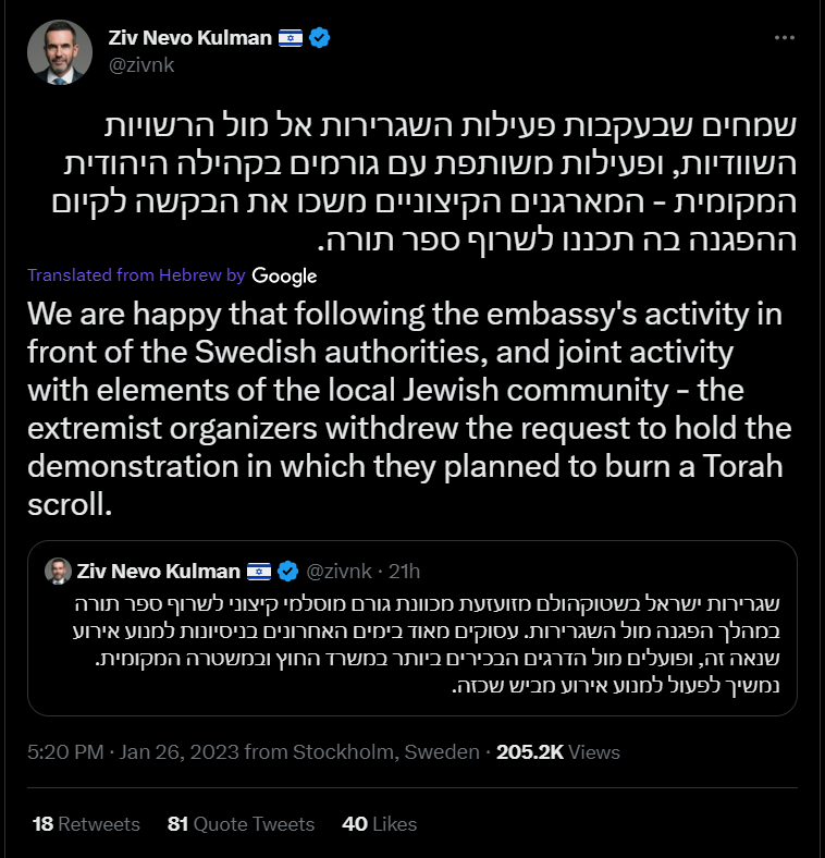 İsrail’in İsveç Büyükelçisi Ziv Nevo Kulman, yaptıkları diplomatik girişimler sonucunda, İsrail Büyükelçiliği önünde Tevrat yakmak isteyen grubun vazgeçirildiğini belirtti: