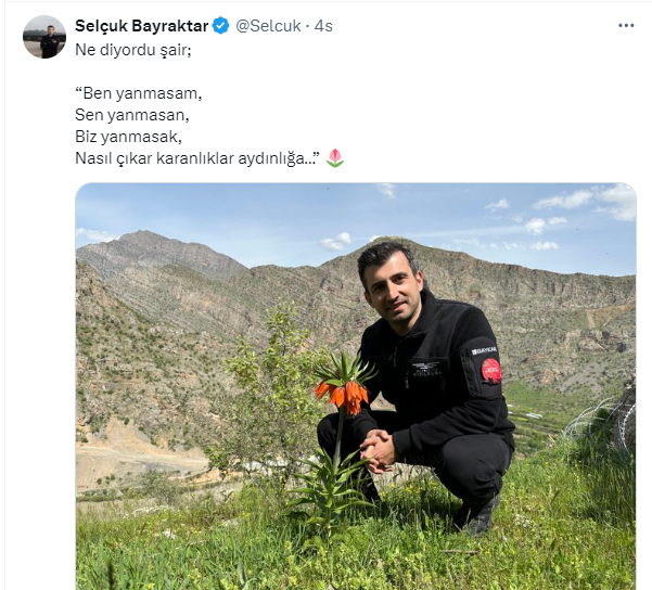 Hakkari'nin Çukurca ilçesinde ters laleyle çektirdiği fotoğrafı paylaşan Bayraktar, şu ifadeleri kullandı: