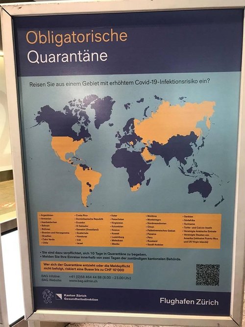 Zürih Havalimanı'nda seyahat edilecek ülkelerdeki karantina durumu hakkında bilgi afişini inceleyenler garip bir durumla karşılaştı. Türkiye'nin haritadan silinmesiyle Karadeniz ile Akdeniz'in birleştiğini görenler şaşkınlıklarını havalimanı yetkililerine bildirdi. Zürih Havalimanı'nda seyahat edenleri karantina mecburiyeti hakkında bilgi vermesi planlanarak asılan plakat'ta bulunan haritada Türkiye yok sayılarak Dünya haritasından silindi.