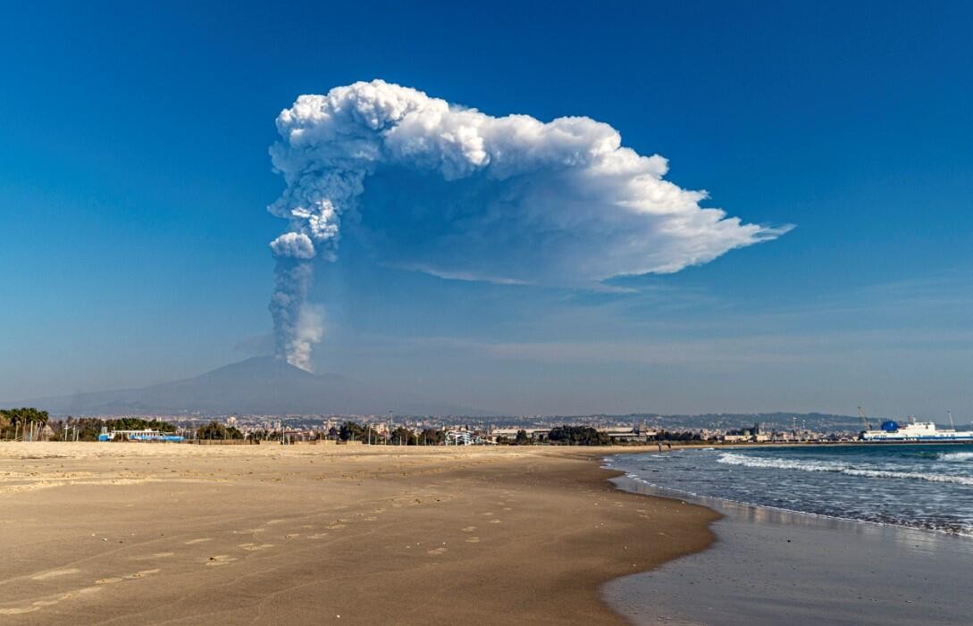 Patlamayla birlikte kilometrelerce yüksekliğe ulaşan kül ve dumanlar, Katanya kentinden böyle görüntülendi.