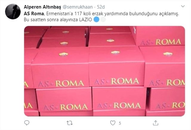 İtalyan ekibinden Roma'dan yapılan skandal açıklamada, taraftarların kendi aralarında topladıkları idman malzemeleri, eşofman, çocuk spor giyimi gibi eşyalardan hazırlanan 117 adet koliyi Roma'da bulunan Ermenistan Büyükelçiliği'ne gönderdiklerini ve kolilerin elçilik tarafından Ermenistan'da bulunan Roma Taraftar Derneği'ne teslim edileceği belirtildi.