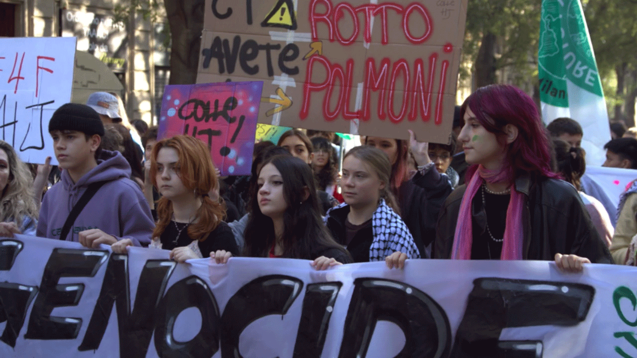 İtalya'da öğrenciler, "Gelecek İçin Cumalar (Fridays for Future)" etkinliklerinde hem İsrail'in Filistinlilere yönelik soykırımına karşı çıkmak hem de çevre ve iklim için büyük bir yürüyüş düzenledi.