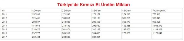 Türkiye İstatistik Kurumu (TÜİK) verilerine göre 2017 yılının 3’üncü çeyrek döneminde toplam kırmızı et üretimi 301 bin 331 ton olarak gerçekleşti. Toplam kırmızı et üretimi kurban bayramı ile birlikte 3’üncü çeyrek döneminde bir önceki döneme göre yüzde 15,6 artarken, bir önceki yılın aynı dönemine göre yüzde 23,6 oranında azaldı.