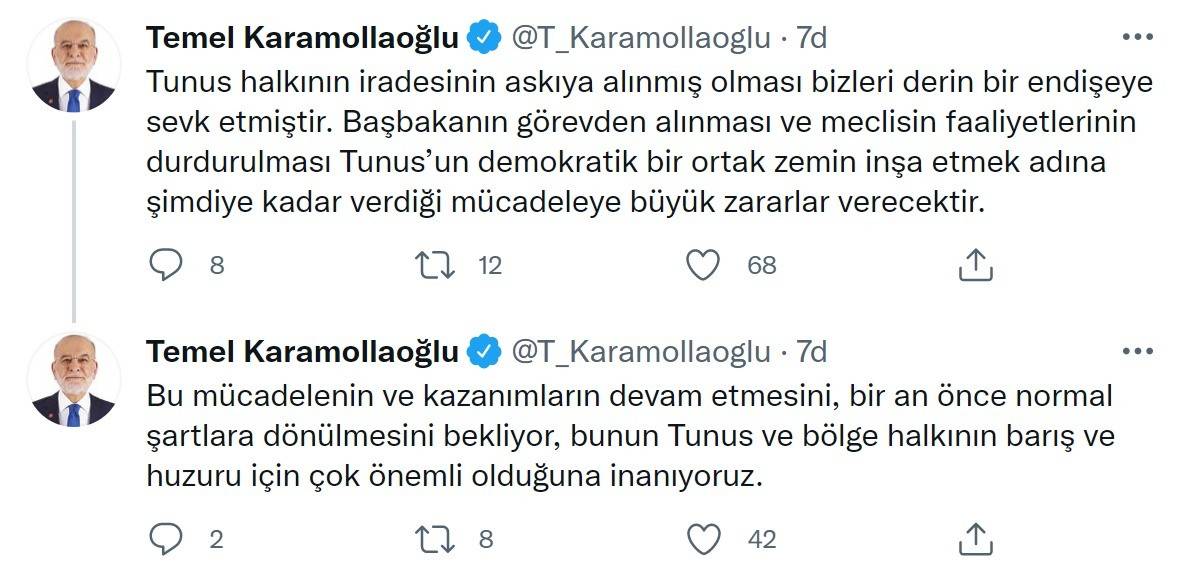 Tunus'taki darbeye bir tepki de Saadet Partisi Genel Başkanı Temel Karamollaoğlu'ndan geldi.