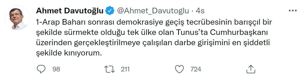 "Arap Baharı sonrası demokrasiye geçiş tecrübesinin barışçıl bir şekilde sürmekte olduğu tek ülke olan Tunus’ta Cumhurbaşkanı üzerinden gerçekleştirilmeye çalışılan darbe girişimini en şiddetli şekilde kınıyorum."