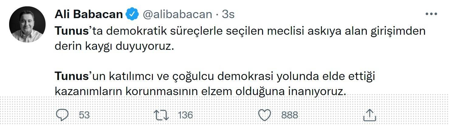 Tunus'ta demokratik süreçlerle seçilen meclisi askıya alan darbe girişiminden derin kaygı duyduklarını belirten DEVA Partisi Genel Başkanı Ali Babacan, "Tunus’un katılımcı ve çoğulcu demokrasi yolunda elde ettiği kazanımların korunmasının elzem olduğuna inanıyoruz" dedi.