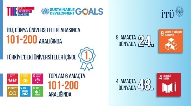 THE’nın derecelendirmesine göre dünya çapında toplam 1.200 civarında üniversitenin değerlendirmeye alındığı listede İstanbul Teknik Üniversitesi (İTÜ), 9’uncu Amaç ‘Sanayi, Yenilikçilik ve Altyapı’ başlığında dünyada 24’üncü, Türkiye’de birinci oldu. 4’üncü Amaç ‘Nitelikli Eğitim’de ise dünyada 48’inci, Türkiye’de de 2’nci basamakta yer alarak büyük bir başarıya imza attı. Ayrıca 7’nci Amaç ‘Erişilebilir ve Temiz Enerji’ ile 17’nci Hedef ‘Amaçlar İçin Ortaklıklar’ başlıklarında büyük ilerleme kaydetti.