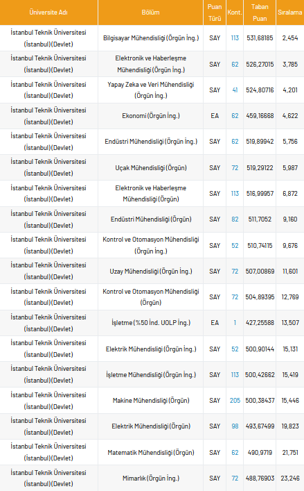 İTÜ taban puanları 2021, yüzdelik dilimleri ve kontenjan sayıları kaçtır?