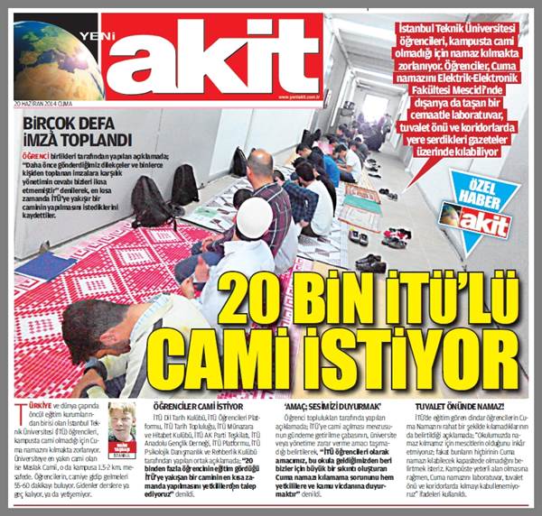 Gazetemiz Akit'in 20 Haziran 2014'te gündeme getirdiği İTÜ'lü Müslüman talebelerin cami talebi sonunda karşılandı.