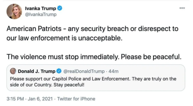 Trump'ın “Lütfen başkent polisini ve emniyet teşkilatımızı destekleyin. Onlar gerçekten ülkemizin yanındalar. Huzurlu kalın!” paylaşıma kızı Ivanka Trump’tan destek geldi.