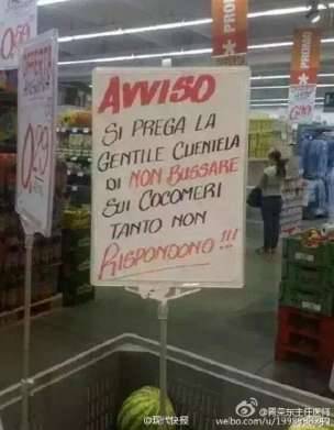 İtalya'nın Milano kentinde, bir süpermarketin karpuz tezgahındaki "Lütfen karpuzları tıklatmaktan vazgeçin, size cevap veremezler uyarısı" binlerce kilometre uzaklıktaki Çin'de sosyal medya üzerinden büyük bir tartışma başlattı.