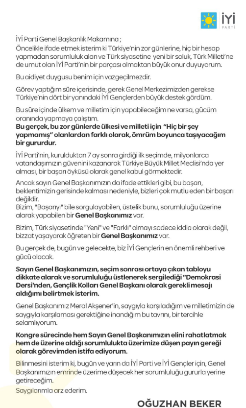 İYİ Parti Gençlik Kolları Başkanı Oğuzhan Beker, Genel Başkan Meral Akşener'in 'elini rahatlatmak' gerekçesiyle istifa ettiğini duyurdu.