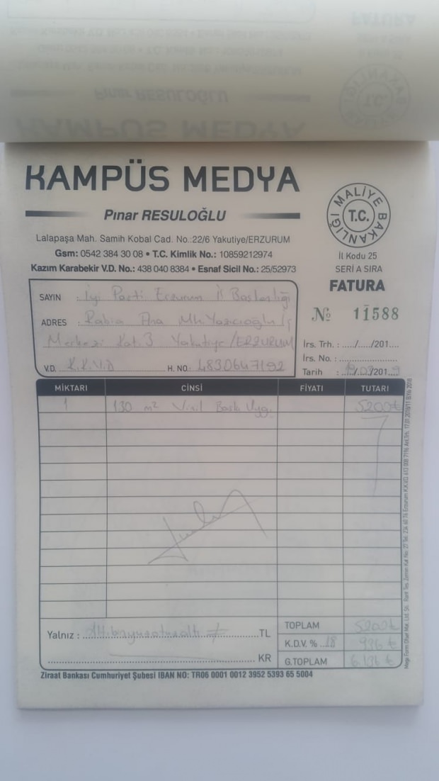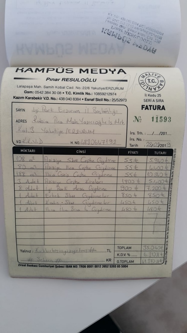 İYİ Parti Erzurum İl Başkanlığı’nın yerel seçimlerde gerçekleştirdiği reklam kampanyalarında sahadaki çalışmalarla ilgili ücretlerin ilgili firmalara ödenmediği ve icranın da bu nedenden ötürü kaynaklandığı belirtildi.