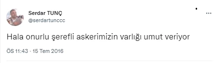 15 Temmuz 2016’da hain darbecilere destek veren tweetler atan Tunç, “Hala onurlu ve şerefli askerimizin varlığı umut veriyor” sözleriyle FETÖ’cü darbecileri övdü.
