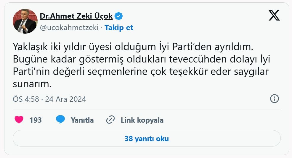 Meral Akşener'in başkanlığı döneminde İYİ Parti'ye katılan emekli askeri hakim Ahmet Zeki Üçok sosyal medya hesabından yaptığı paylaşımda İYİ Parti’den istifa ettiğini açıkladı.