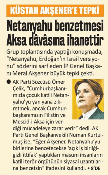 İP'li Akşener, partisinin Mayıs ayındaki bir grup toplantısında, Cumhurbaşkanı Recep Tayyip Erdoğan'ı çocuk katili Netenyahu ile bir tutarak, partide yoldan çıkan ilk isim olmuştu.