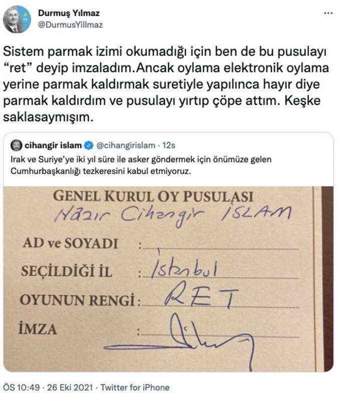 CHP İstanbul Milletvekili Cihangir İslam'ın oy pusulasını paylaştığı tweeti alıntılayan Yılmaz, "Sistem parmak izimi okumadığı için ben de bu pusulayı "ret" deyip imzaladım. Ancak oylama elektronik oylama yerine parmak kaldırmak suretiyle yapılınca 'Hayır' diye parmak kaldırdım ve pusulayı yırtıp çöpe attım. Keşke saklasaymışım" ifadelerini kullandı.