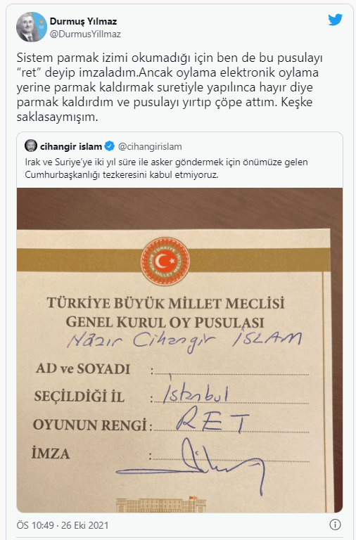 CHP İstanbul Milletvekili Cihangir İslam'ın oy pusulasını paylaştığı tweeti alıntılayan Yılmaz, "Sistem parmak izimi okumadığı için ben de bu pusulayı "ret" deyip imzaladım. Ancak oylama elektronik oylama yerine parmak kaldırmak suretiyle yapılınca hayır diye parmak kaldırdım ve pusulayı yırtıp çöpe attım. Keşke saklasaymışım." ifadelerini kullandı.