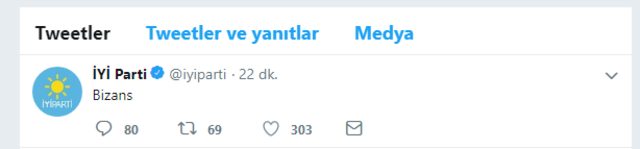 İYİ Parti'nin hesabından atılan tweette 'Bizans' ifedesi kullanıldı. Atılan tweete görünler ise hiç bir anlam veremedi. İYİ Parti'nin tweeti sosyal medyada kısa sürede gündem oldu. Öte yandan parti tarafından henüz bir açıklama yapılmadı.